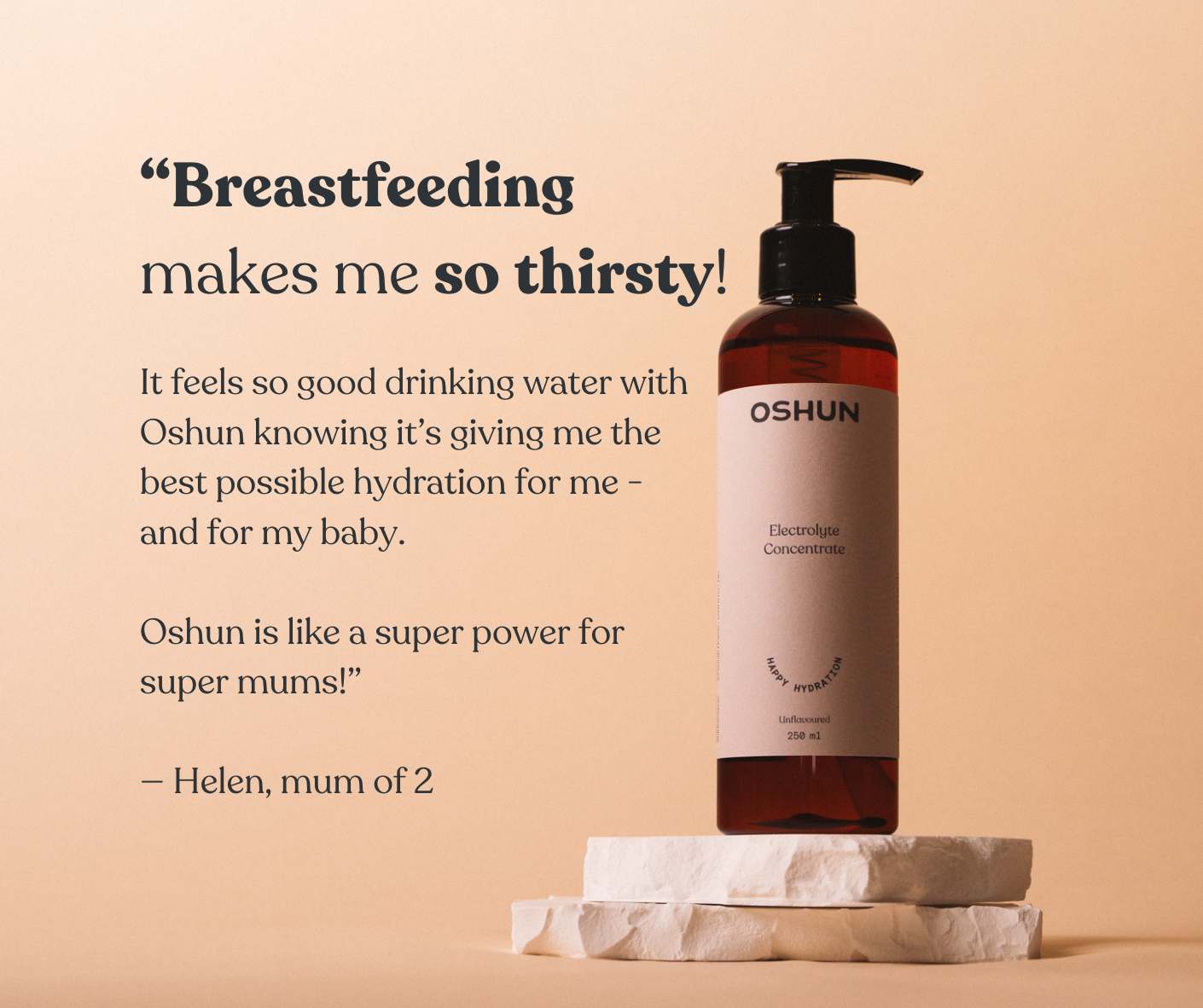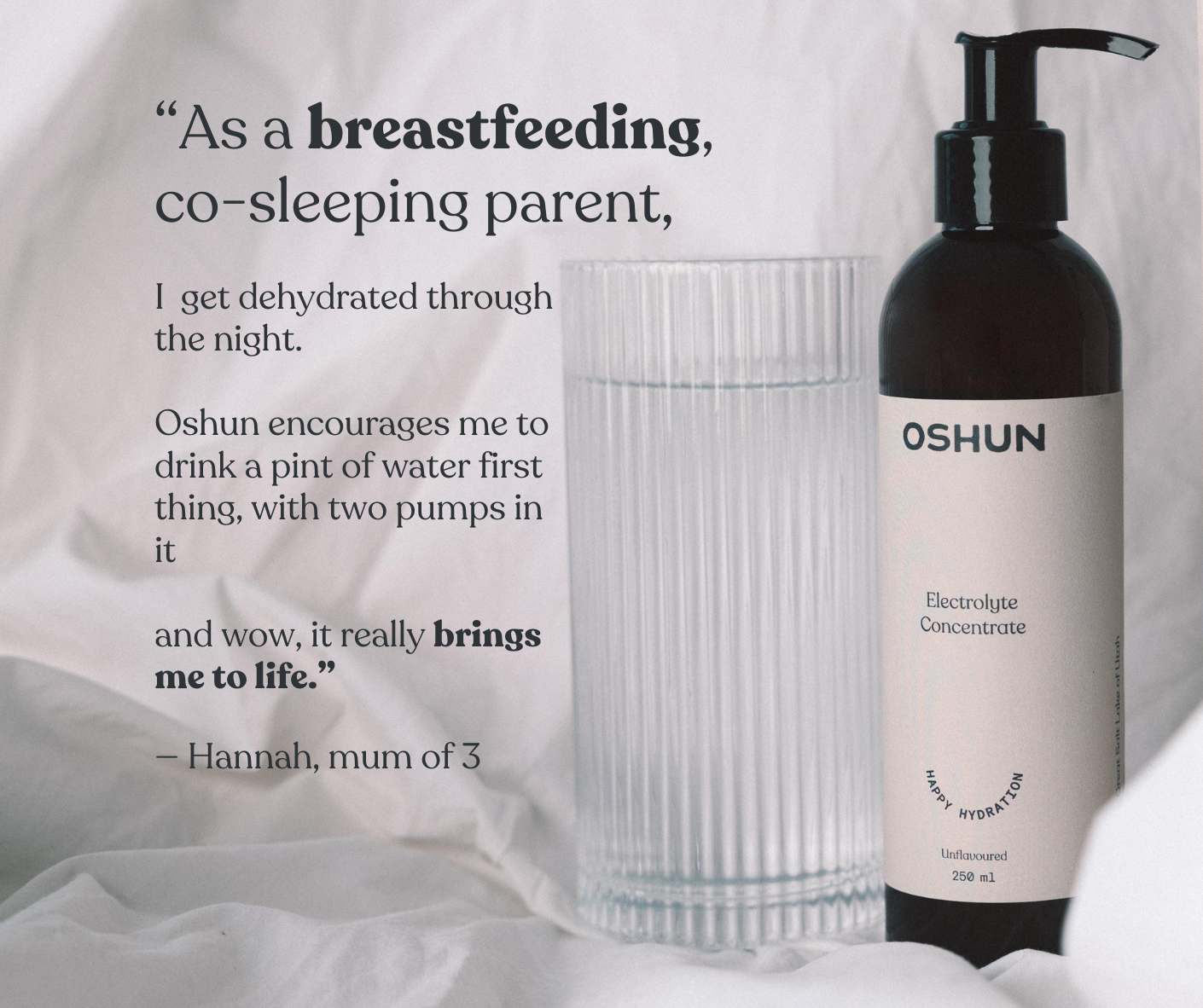 “Pregnancy and breastfeeding increase your mineral and hydration needs by up to 50%. Low energy, brain fog and sweet cravings are common signs these requirements aren't met. Oshun is my go-to as it’s an easy, flavour-free and effective way to address these challenges.”